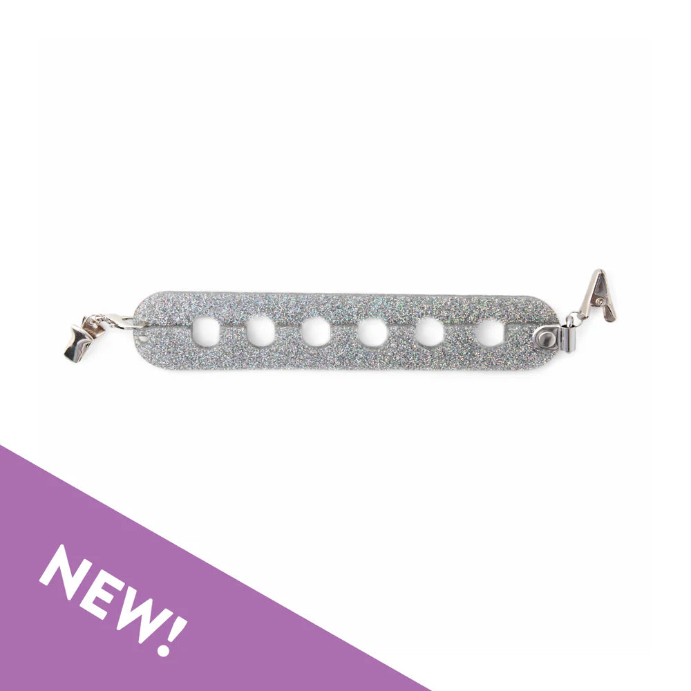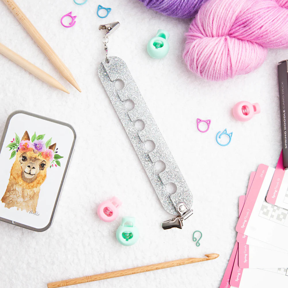 the yarn gator from twice sheared sheep is a universal yarn divider that can be clipped onto any bag, keeps your yarn separated and tangle free, and then can be easily removed without cutting your yarn! it has holes for six different colors and can be used with lace weight to super bulky yarn.